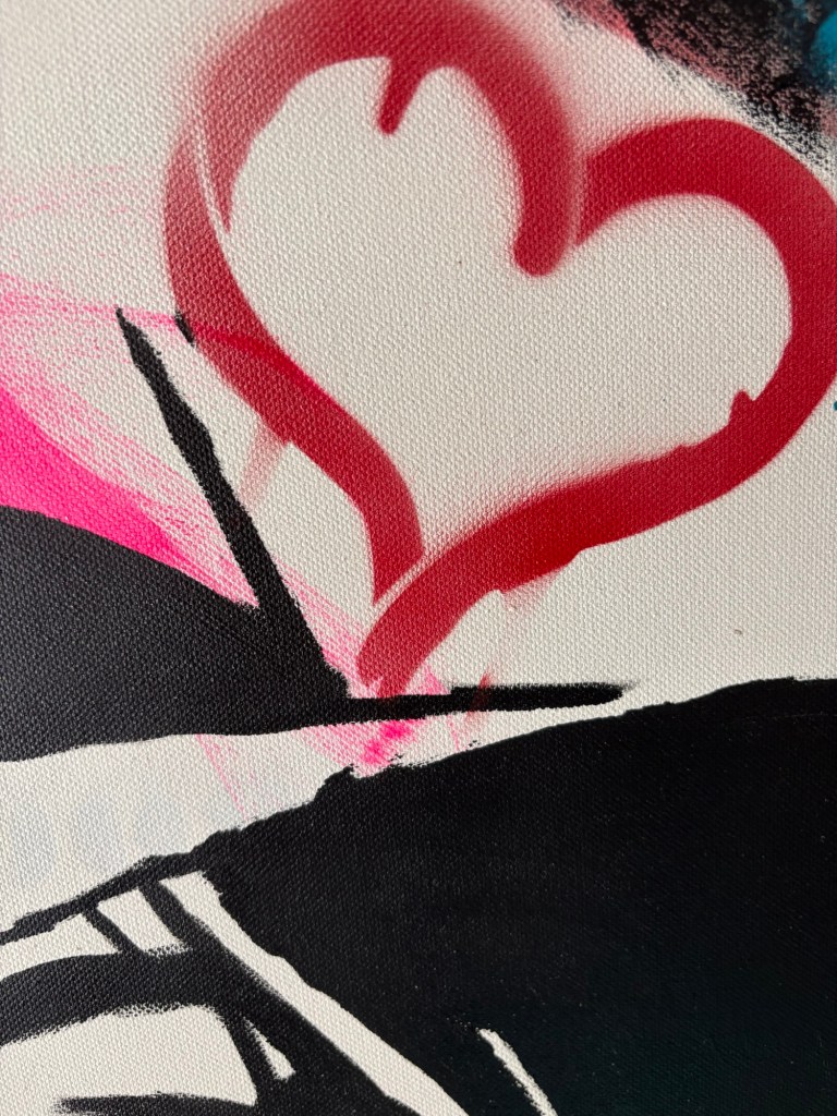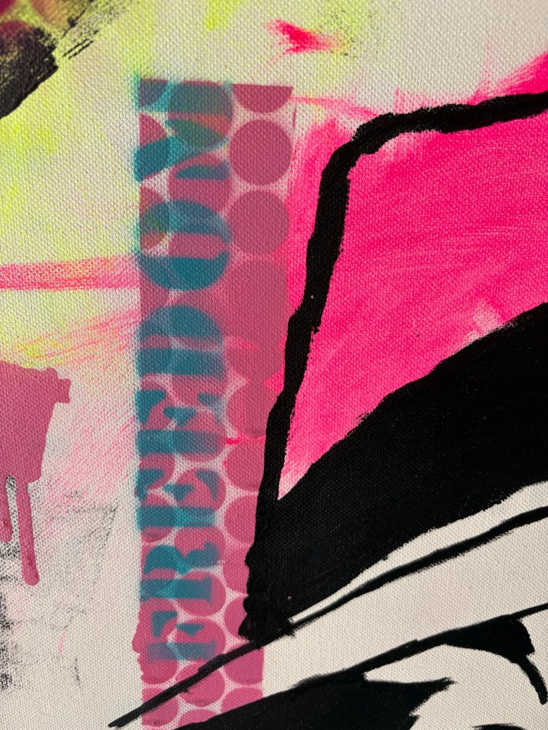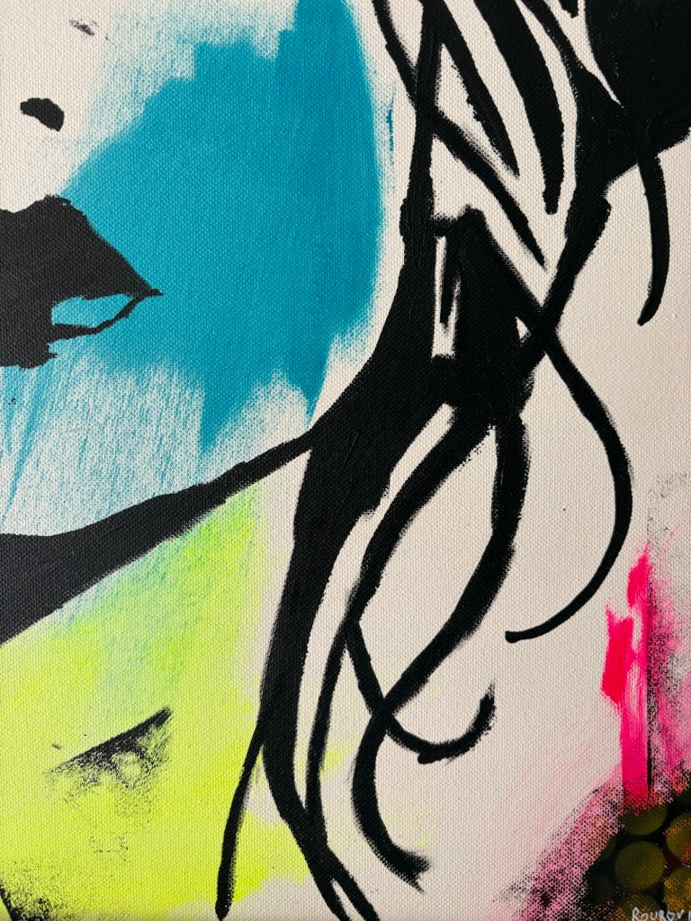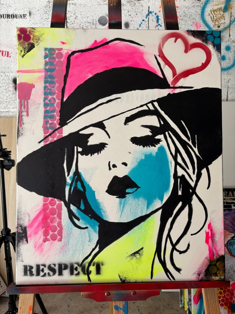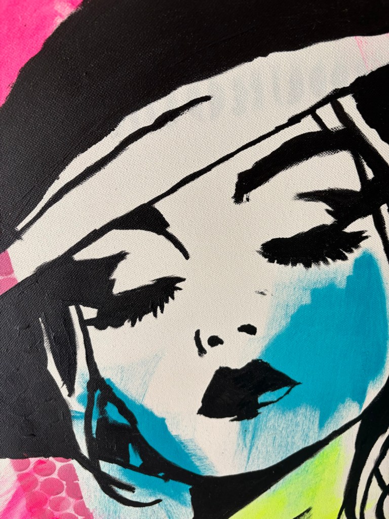 Icône urbaine et féminine, cette œuvre capture l’élégance et la force dans un même souffle. Les lignes noires franches du pochoir structurent le visage, tandis que les éclats de rose fluorescent, de bleu vif et de jaune néon insufflent une énergie pop et contemporaine.